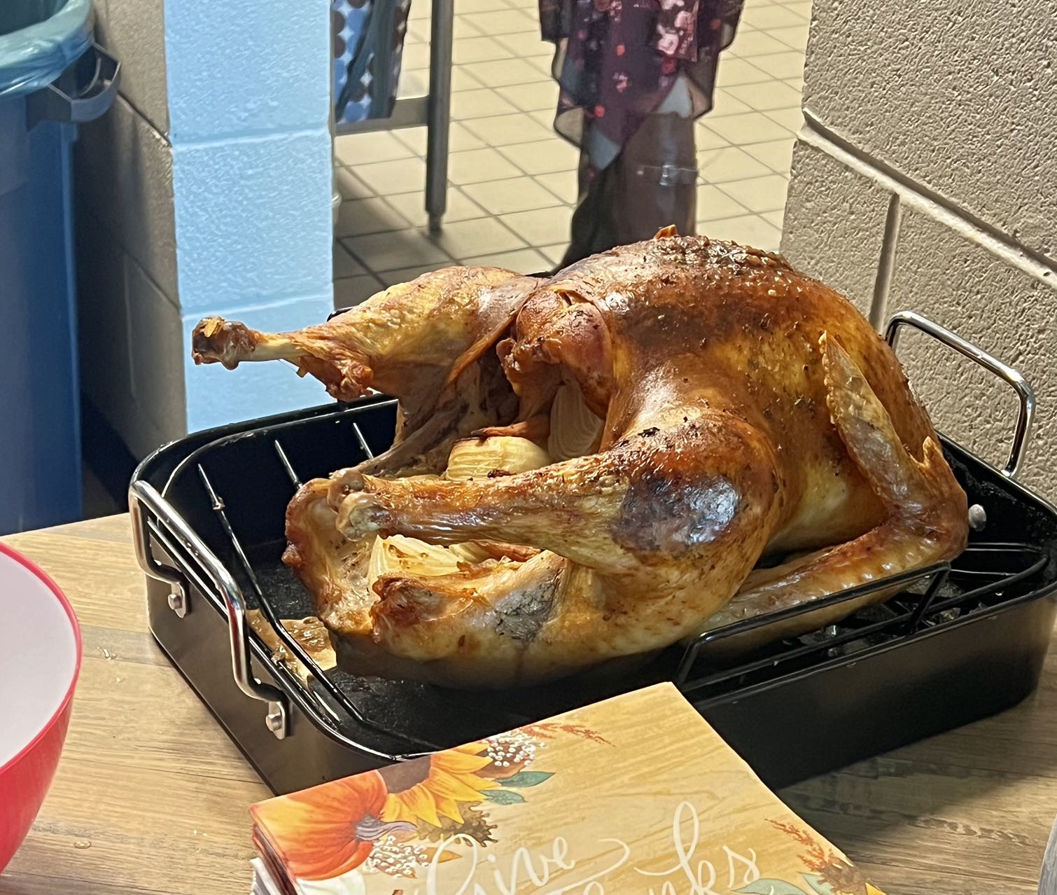 (春田当地美国家庭准备的火鸡和丰盛的感恩节晚餐)